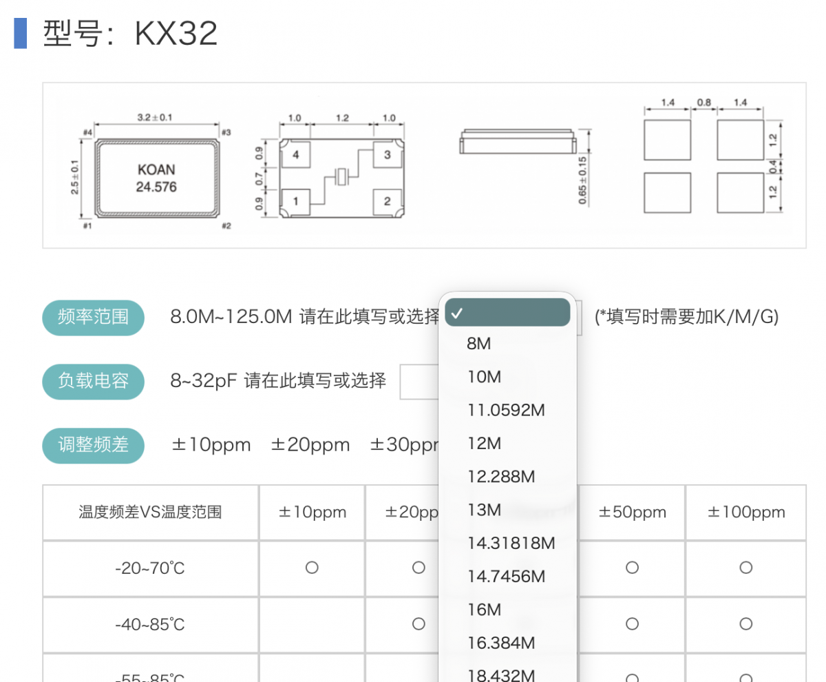 为了让设计与选型用户在选型时更高效,凯擎小妹在KOAN晶振官网的参数选择页面完善常用频率下拉列表,可快速选择,提高选型效率。如果您的设计需要列表之外的频率,也可以直接输入:
